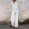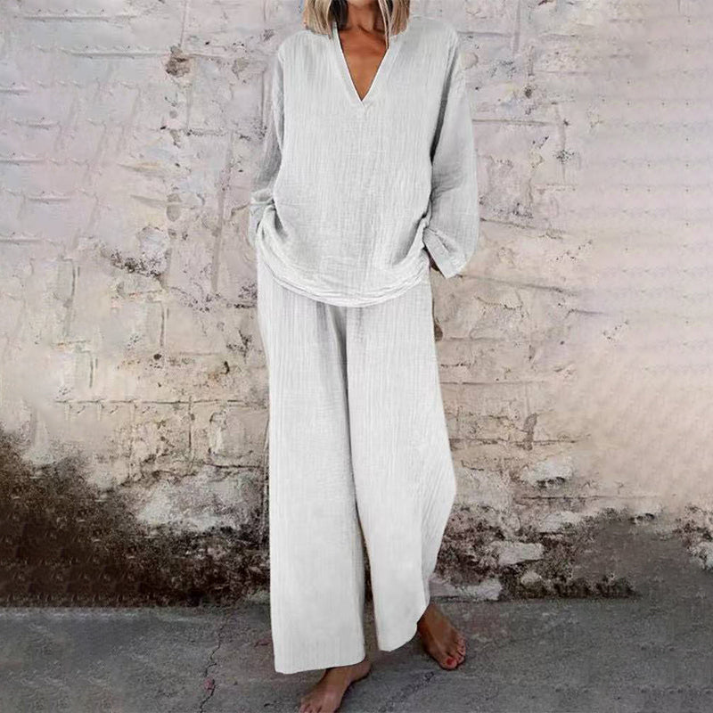 Lekko marszczony, luźny strój casualowy- Bluzka z długim rękawem i dekoltem w szpic oraz spodnie z szerokimi nogawkami mają lekkie marszczenia, które nadają im naturalny wygląd. Luźny krój został zaprojektowany tak, aby pasował do różnych typów sylwetki, dzięki czemu jest zarówno wygodny, jak i swobodny.
