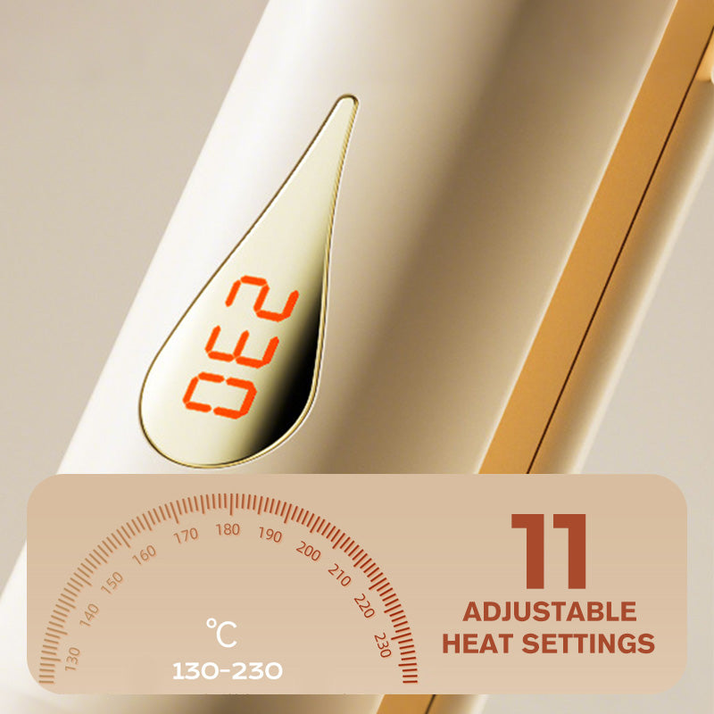 11 regulowanych ustawień ciepła z wyświetlaczem LCD: Dostosuj i dostosuj ustawienia ciepła za pomocą wyraźnego wyświetlacza LCD, aby zapewnić precyzyjną kontrolę nad cienkimi, grubymi lub puszącymi się włosami, zapewniając gładkie, wolne od uszkodzeń loki za każdym razem.