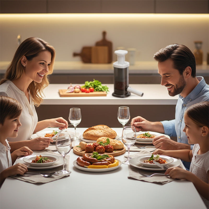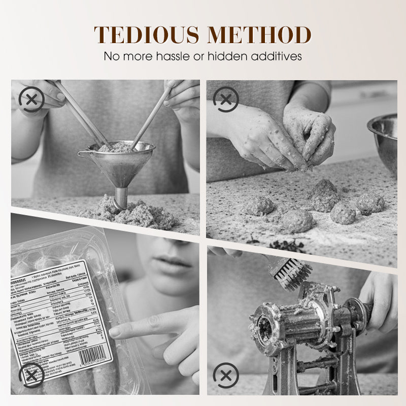 Bardzo duża pojemność 2 litrów: Załaduj więcej kiełbas za jednym razem. Pojemny zbiornik mieści do 1 kg (2,2 funta) mięsa, zmniejszając potrzebę częstego uzupełniania i upraszczając przygotowywanie kiełbas od początku do końca.