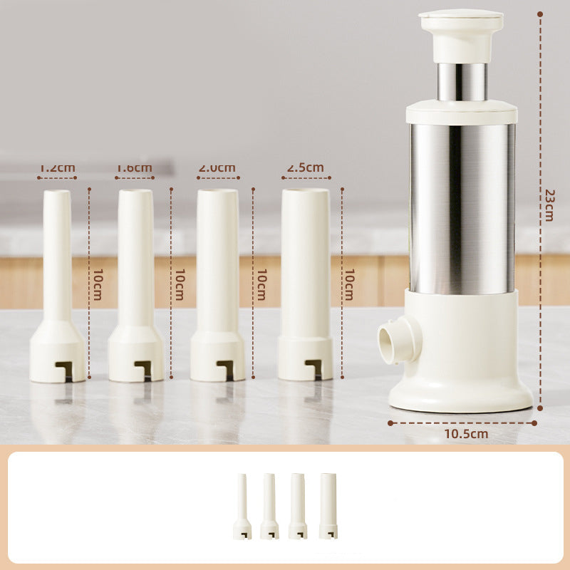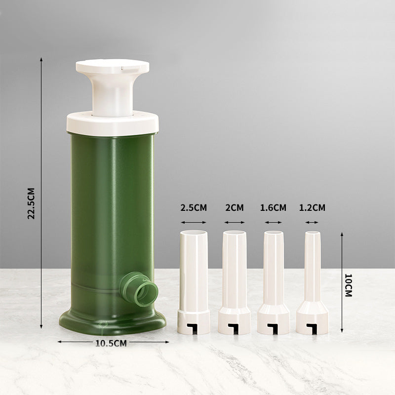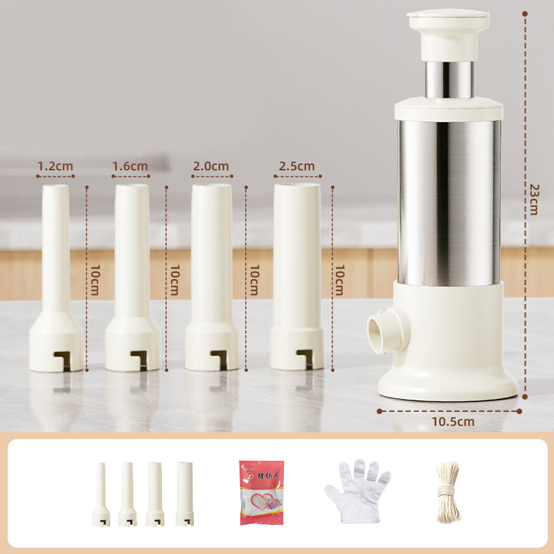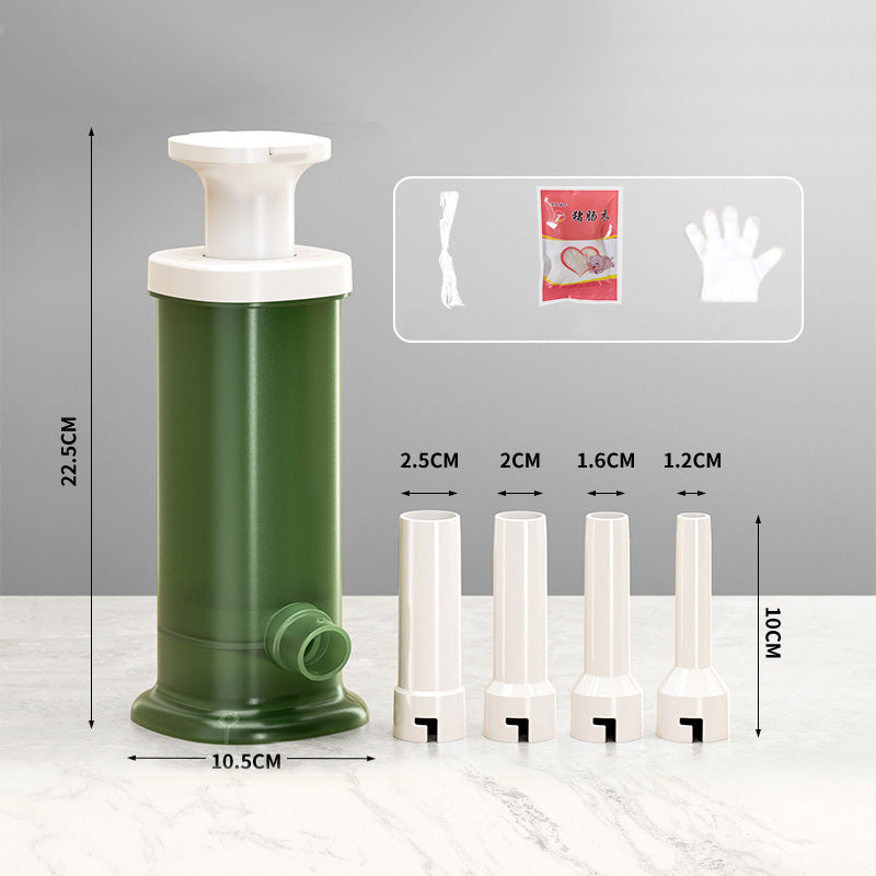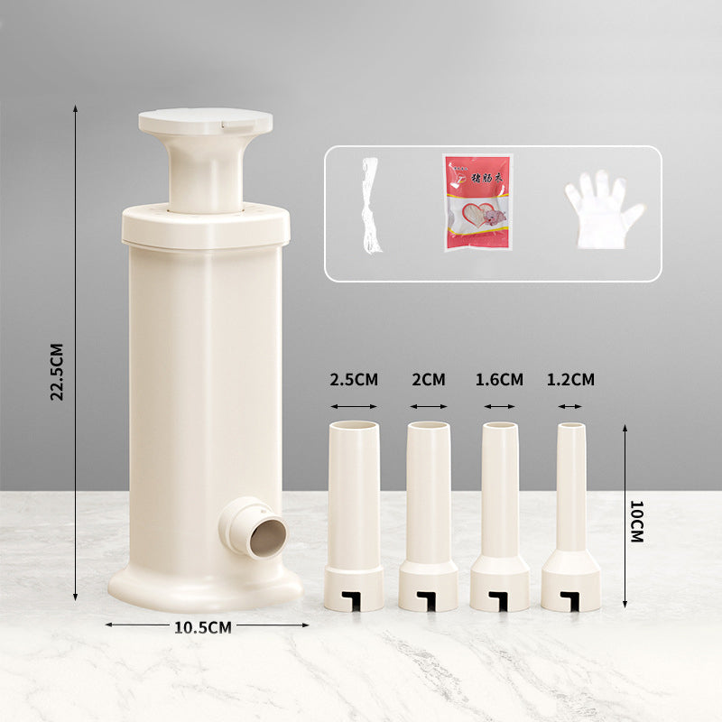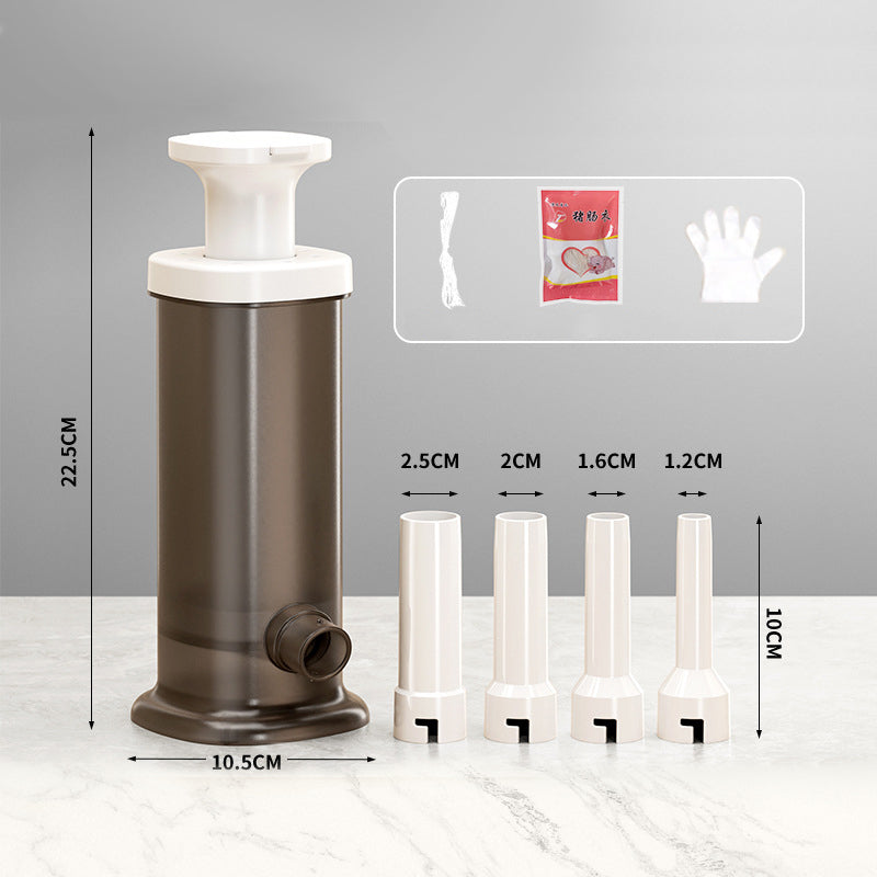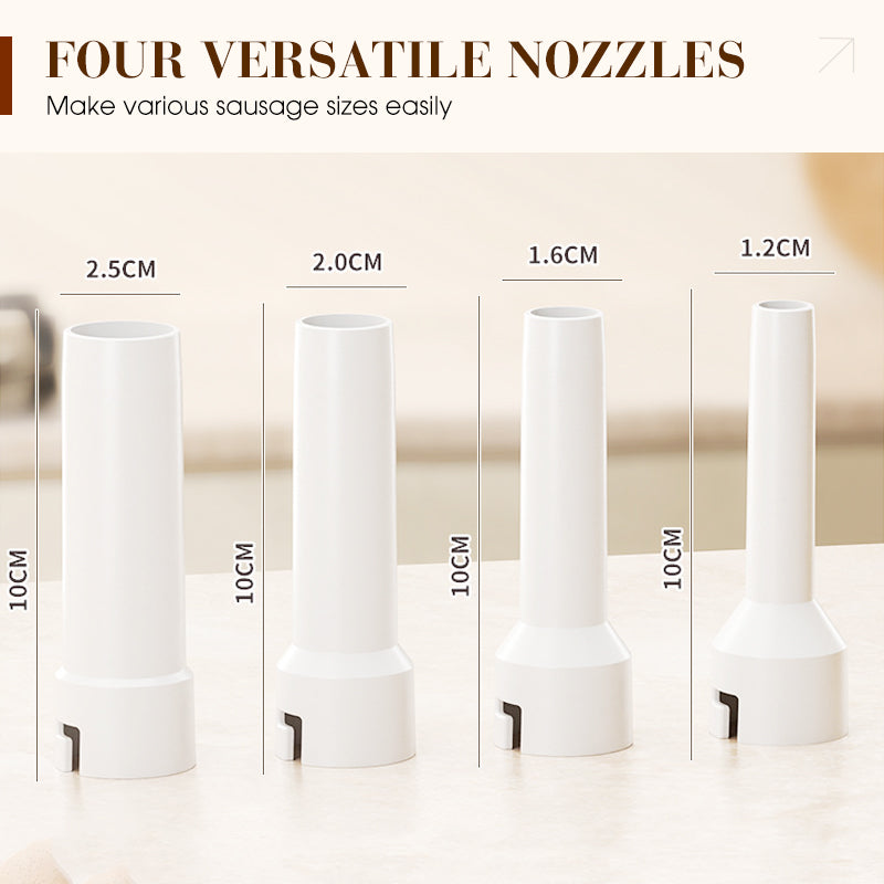 Uniwersalny zestaw dysz: Użyj czterech dołączonych dysz, aby przygotować kiełbaski w różnych rozmiarach. Dysze mają rozmiar od 1,2 cm do 2,5 cm, co daje swobodę przygotowywania zarówno cienkich, jak i grubych kiełbasek śniadaniowych.