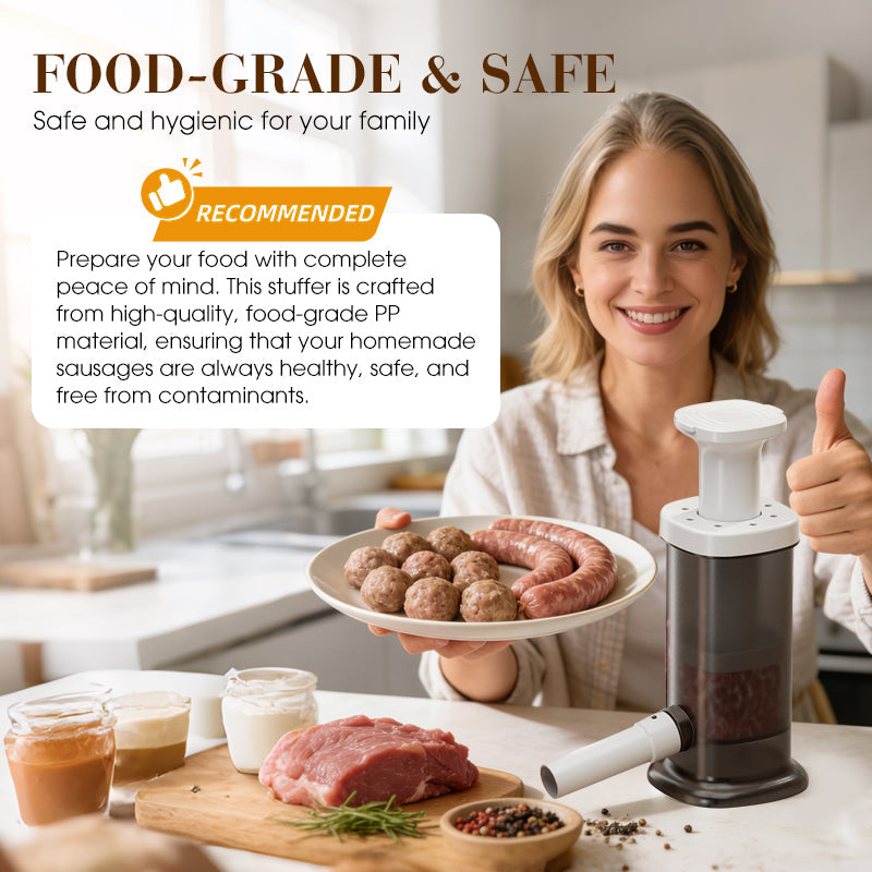 Bezpieczeństwo klasy spożywczej: Przygotowuj jedzenie bez obaw. Nadziewarka wykonana jest z wysokiej jakości materiału PP przeznaczonego do kontaktu z żywnością, dzięki czemu domowe kiełbaski są zawsze zdrowe, bezpieczne i wolne od zanieczyszczeń.