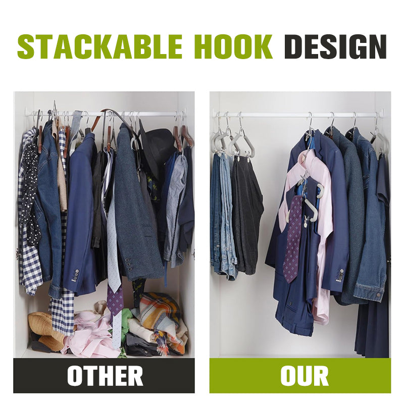 Konstrukcja haczyka umożliwiająca układanie w stosy-Ten innowacyjny haczyk umożliwia układanie wielu wieszaków w stosy w pionie, co pozwala maksymalnie wykorzystać przestrzeń w szafie, jednocześnie zapewniając porządek i łatwy dostęp do ubrań. Szczególnie dobrze sprawdza się w niewielkich pomieszczeniach.