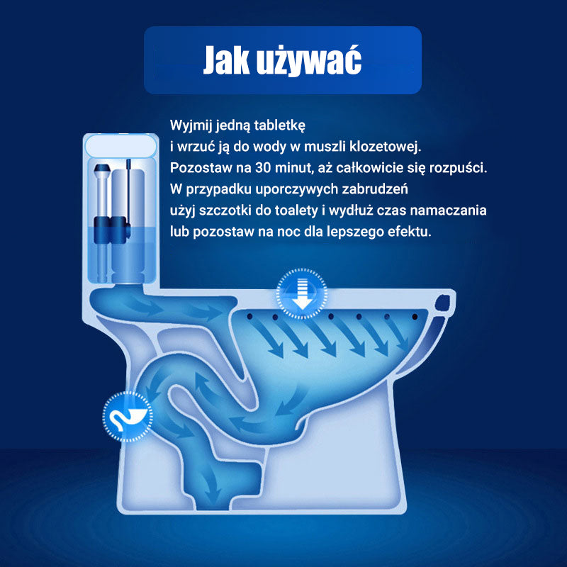 Tabletki do czyszczenia toalet- Skuteczne w usuwaniu uporczywych plam poniżej linii wody, a także plam z moczu, kamienia, śladów rdzy i głęboko osadzonego brudu wewnątrz muszli klozetowej, zapewniając dokładne czyszczenie.
