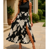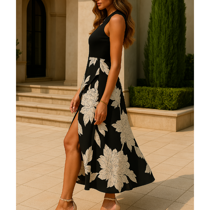 Górna część koszulki ma prosty, jednolity kolor i przylegający do ciała krój bez rękawów, który emanuje niewymuszoną elegancją i zapewnia chłód latem. Spódnica prezentuje romantyczny kwiatowy wzór, tworząc wyraźny kontrast wizualny i dodając głębi Twojemu wyglądowi, jednocześnie podkreślając Twój wdzięczny i modny styl.