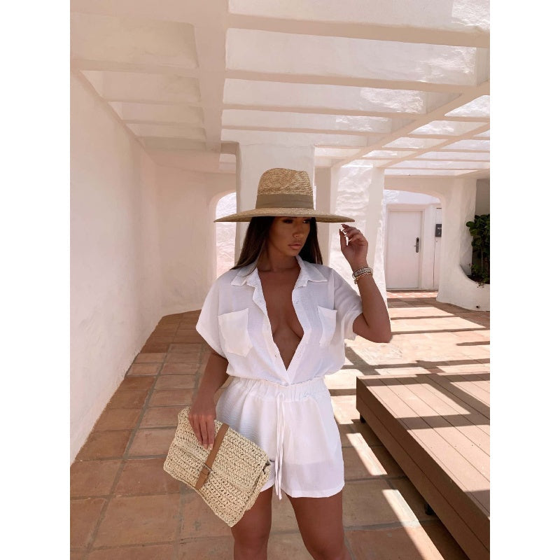 Ten dwuczęściowy strój kąpielowy ma głęboki dekolt w kształcie litery V z pojedynczym rzędem guzików i luźny krój, który pasuje do każdego typu sylwetki. Dwie przednie kieszenie na piersi dodają funkcjonalności i stylu. Oddychające krótkie rękawy i miękkie linie tworzą stylowy i swobodny strój na co dzień do odpoczynku lub wyjścia.