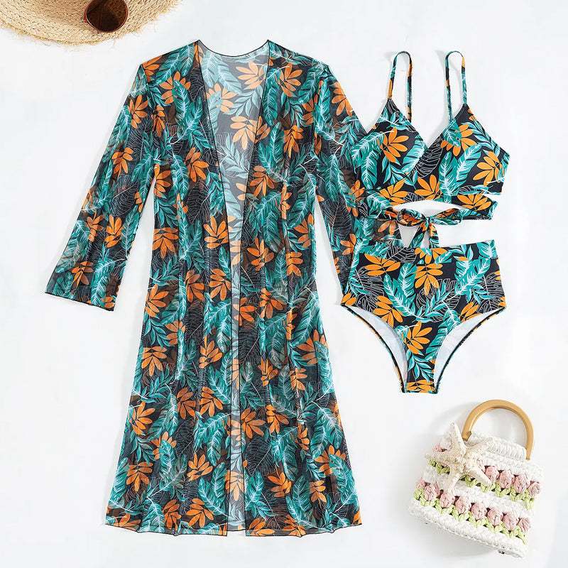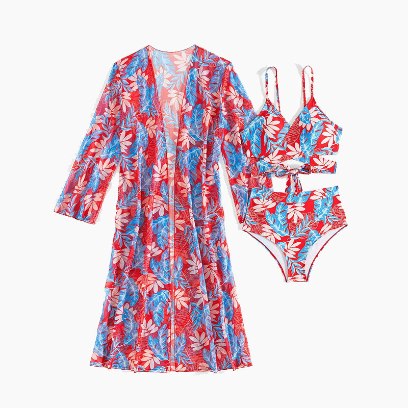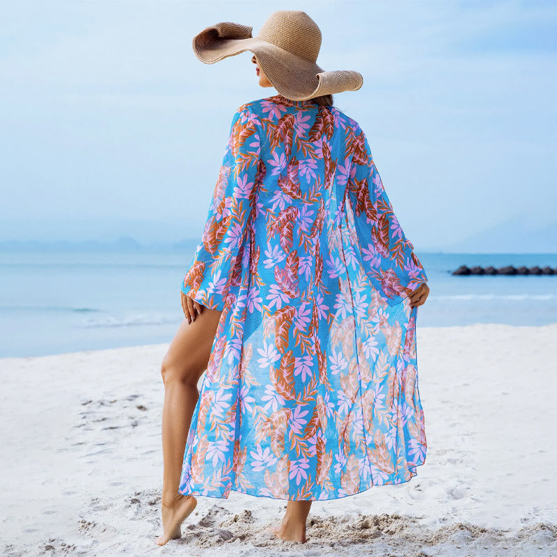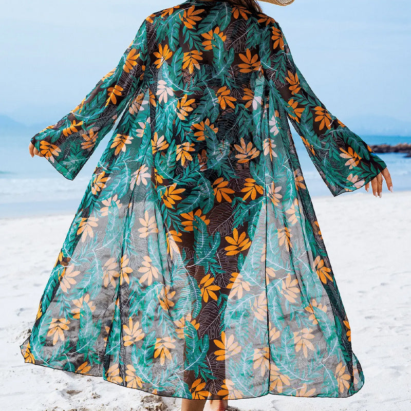 MODNY NADRUK KWIATOWY: Żywy kwiatowy wzór i narzutka typu kimono tworzą stylową, elegancką i seksowną kombinację stroju plażowego.