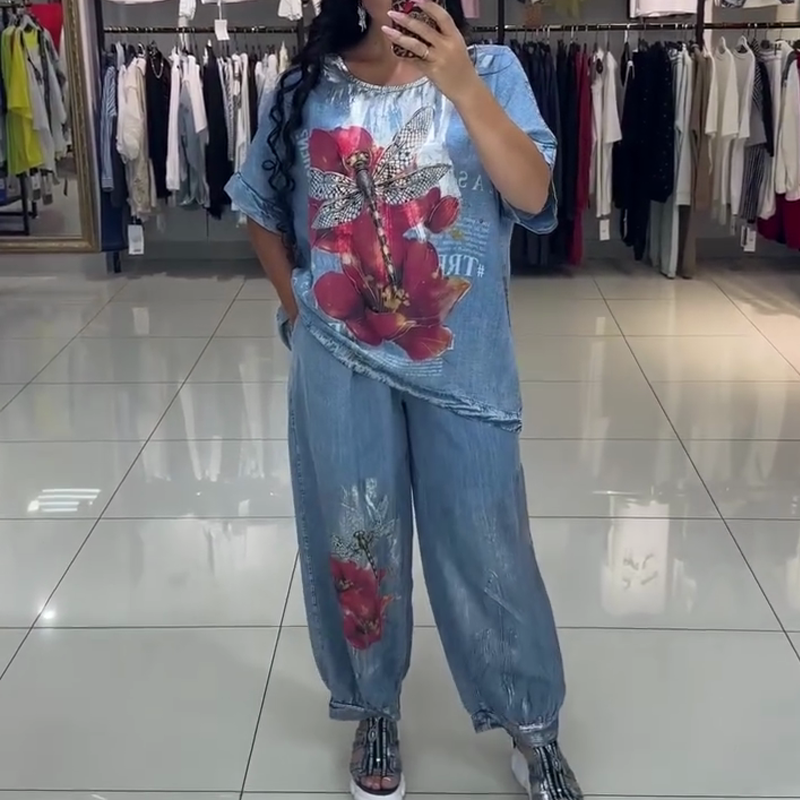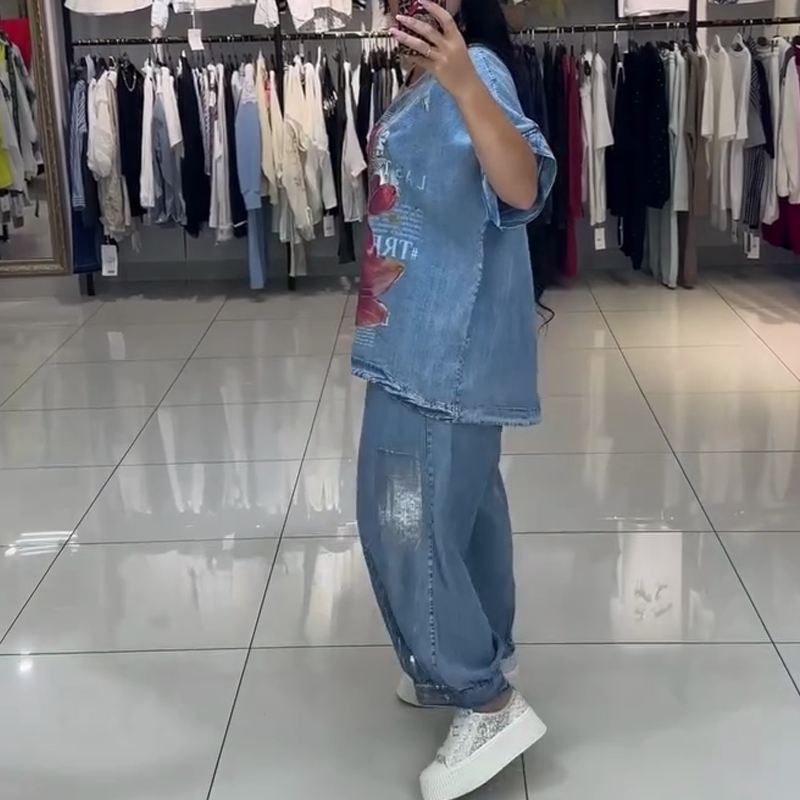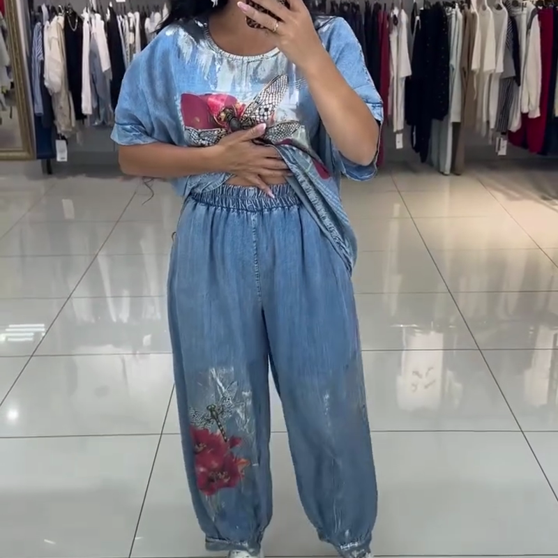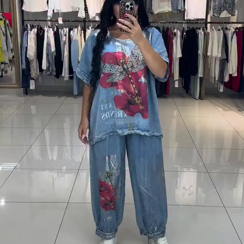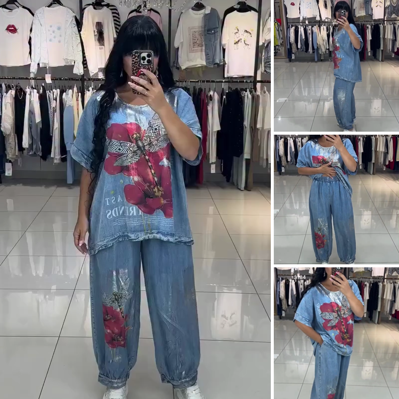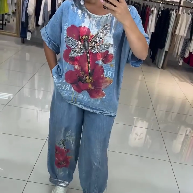 Czerwone kwiaty i motyle nadrukowane na tym zestawie przyciągają wzrok. Wyraziste wzory na niebieskiej koszulce z krótkim rękawem i dopasowanych dżinsach tworzą zabawny i modny styl, dodając Twojej stylizacji wyjątkowego charakteru.