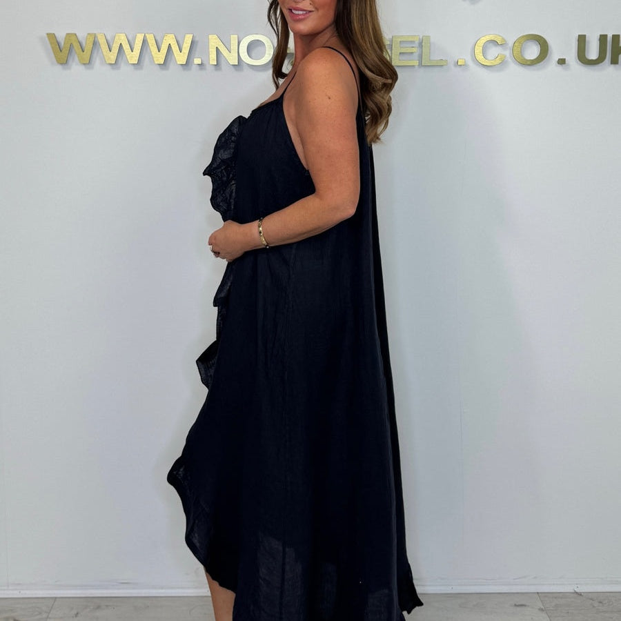 ДИЗАЙН С ДЕТАЙЛИ ОТ РЪФЛИ ЗА ЖЕНСКО ПОВЕДЕНИЕ: Деликатните акценти от къдрички придават нежен чар и текстура, като подчертават цялостната елегантност на роклята и ѝ придават закачливо, романтично излъчване.