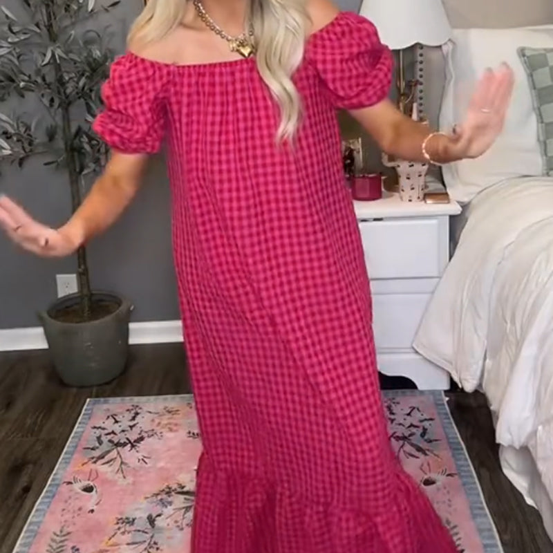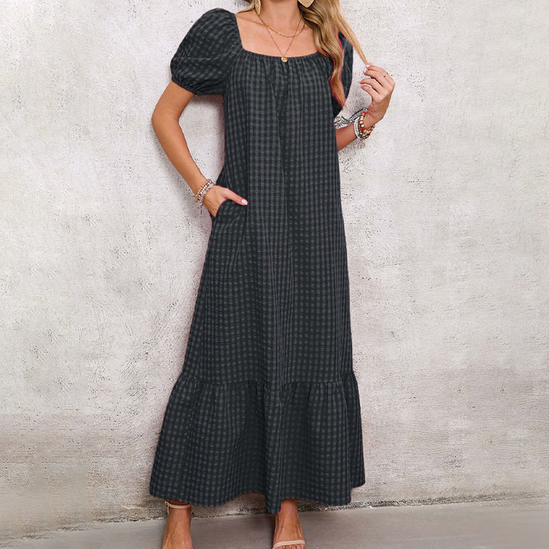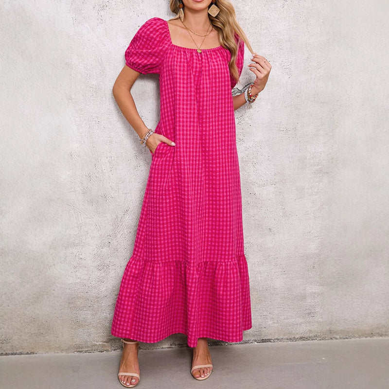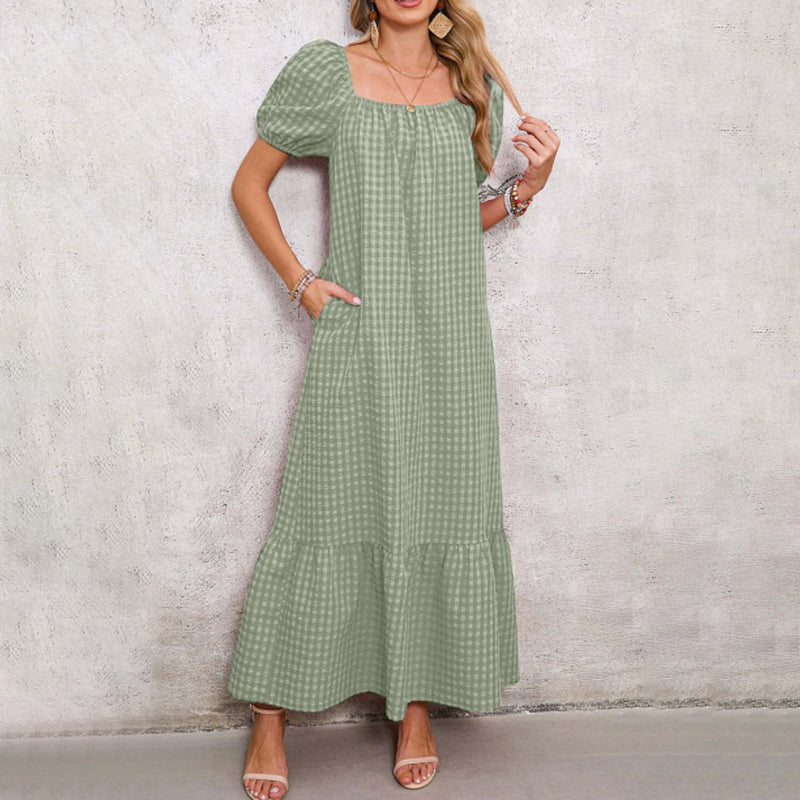 STYLOWE WZORNICTWO: Podnieś swoją garderobę dzięki eleganckiemu kwadratowemu dekoltowi i delikatnemu marszczonemu dołowi. Bufiaste rękawy dodają figlarnego charakteru, a lejąca długość maxi zapewnia wyrafinowanie.