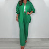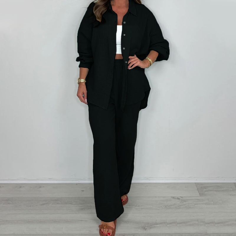 Miękka i przewiewna tkanina: Ten zestaw został wykonany z lekkiej i przewiewnej tkaniny, która zapewnia komfort w każdej porze roku, zachowując jednocześnie elegancki i świeży wygląd.